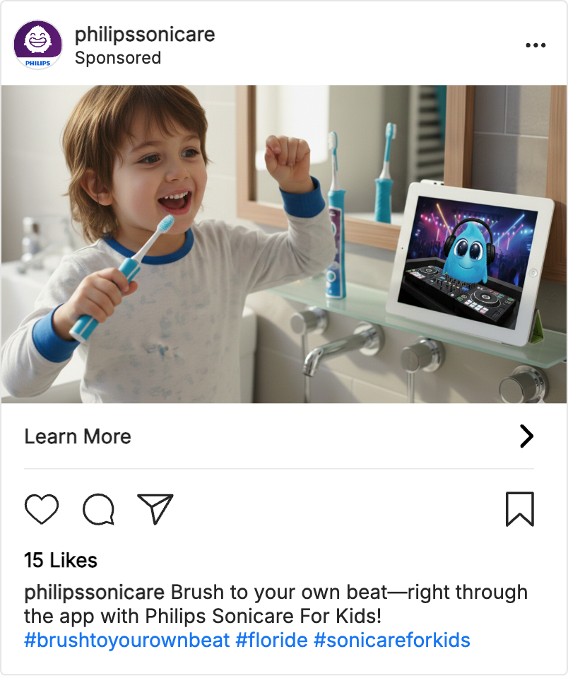 The Philips Sonicare For Kids app, already featuring Sparkly, now introduces DJ FloRide and a feature that syncs brushing to music via a Bluetooth-connected toothbrush. Each session generates a unique beat in the app, letting kids remix their tracks with FloRide